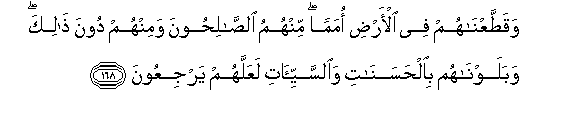 Dan Kami pecah-pecahkan mereka (kaum Yahudi itu) berpuak-puak (yang bertaburan di merata-rata) dunia ini. Di antara mereka ada yang soleh dan di antaranya juga yang tidak demikian dan kami uji mereka dengan nikmat pemberian yang baik-baik dan bala bencana yang buruk, supaya mereka kembali (bertaubat).