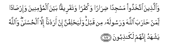 Dan (di antara orang-orang munafik juga ialah) orang-orang yang membina masjid dengan tujuan membahayakan (keselamatan orang-orang Islam) dan (menguatkan) keingkaran (mereka sendiri) sertamemecah-belahkan perpaduan orang-orang yang beriman dan juga untuk (dijadikan tempat) intipan bagi orang yang telah memerangi Allah dan RasulNya sebelum itu dan (apabila tujuan mereka yang buruk itu ketara), mereka akan bersumpah dengan berkata: Tidaklah yang kami kehendaki (dengan mendirikan masjid ini) melainkan untuk kebaikan semata-mata. Padahal Allah menyaksikan, bahawa sesungguhnya mereka adalah berdusta.