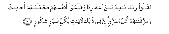 (Maka kamakmuran dan kemudahan itu menjadikan mereka sombong dan kufur) lalu berkata: Wahai Tuhan kami, jauhkanlah jarak perjalanan kami (di antara sebuah bandar dengan yang lain) dan mereka berlaku zalim kepada diri mereka sendiri; lalu Kami jadikan (kisah perbuatan derhaka) mereka: Buah mulut orang ramai, serta kami pecah belahkan mereka berkecai-kecai. Sesungguhnya kisah mereka yang tersebut mengandungi tanda-tanda (yang besar pengajarannya bagi tiap-tiap seorang (mukmin) yang sentiasa bersikap sabar, lagi sentiasa bersyukur.