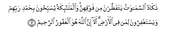 Alam langit nyaris-nyaris pecah dari sebelah atasnya (kerana ngeri dan takutnya kepada kemurkaan Allah terhadap penduduk bumi yang lupakan kebesaran Allah sehingga menyeleweng dari jalan yang benar); dan malaikat bertasbih dengan memuji Tuhannya serta memohon ampun bagi makhluk-makhluk yang ada di bumi. Ingatlah! Sesungguhnya Allah, Dia lah Yang Maha Pengampun, lagi Maha Mengasihani.